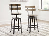 Delight in the effortless two-tone look of this swivel barstool. Dark iron-tone metal and distressed brown wood pair for a rustic look with modern sensibility. A ladderback design brings additional charm. The adjustable height, swivel motion and footrest allow you to find your ideal comfort position.