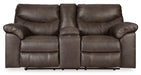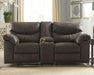 Rock the cool look of leather minus the hefty price tag with this reclining loveseat with console. Rich with tonal variation, the indulgently soft upholstery sure looks like the real thing. And talk about indulgent comfort. Double stuffed armrests and sumptuous cushions cradle and support in all the right places. Distinctive scooped stitching enhances this reclining loveseat’s contemporary flair. Cup holders and hidden storage complete the experience.
